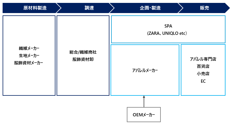 アパレル産業は、繊維や資材のメーカーから素材を仕入れ、アパレルメーカーが既製服を製造し、流通業に製品を提供し、小売業が消費者に販売する、という流れが基本となります。